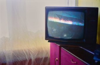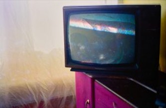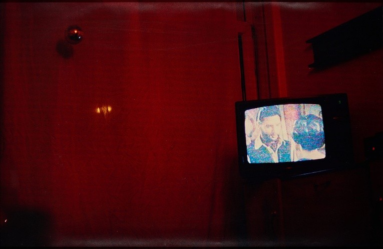 Photographed at SHARP’S home studio in their council flat, the first pair of images shows Elvis on a retro TV set in a harsh red-toned dimly lit room with the curtains drawn. The second pair display another shot of Elvis with a cowboy hat on the TV, the frame more cropped than before and the light this time is soft and pink which overflows the still drawn curtains.