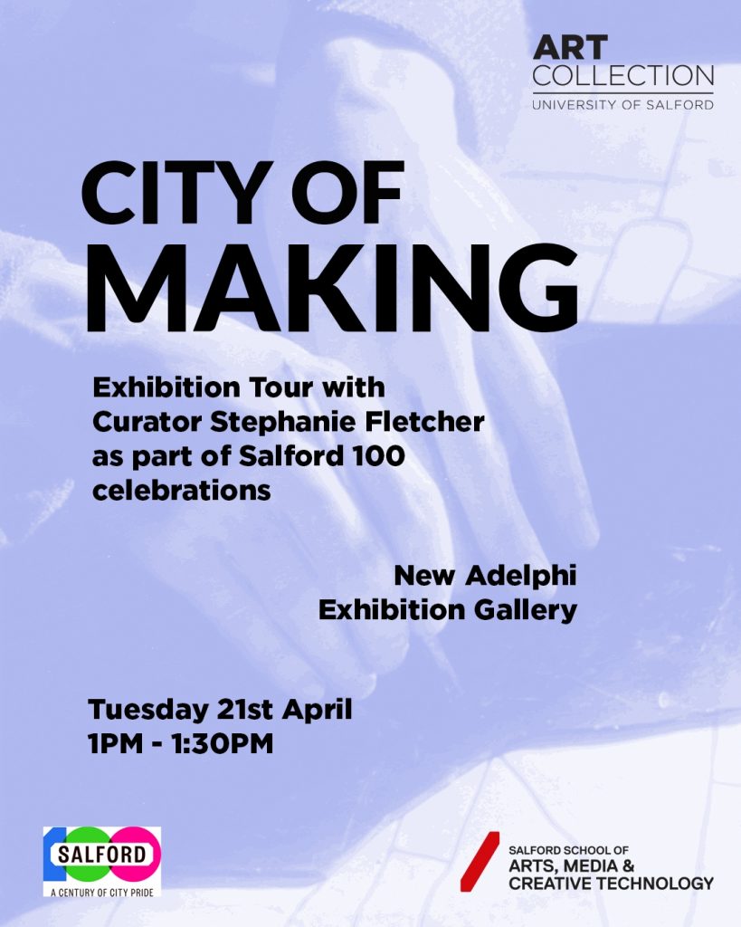 To mark the celebration of Salford’s 100 year anniversary, join curator Stephanie Fletcher for a informal, lunchtime gallery tour of City of Making, an exhibition bringing together contemporary art with historic archives images, reflecting on Salford’s history and future as the city of making.